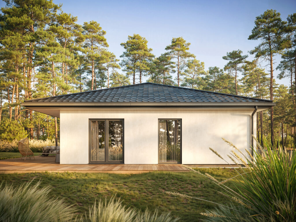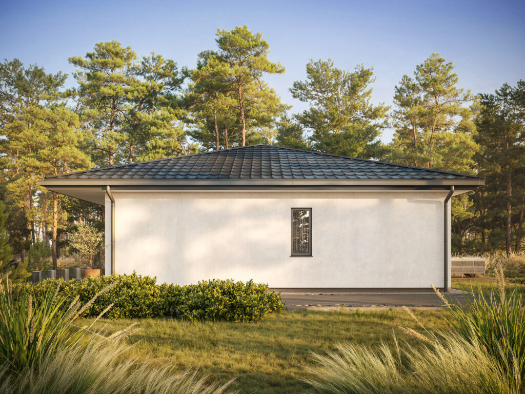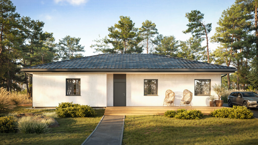 W wersji podstawowej Prenovi 130 z białym tynkiem i grafitową stolarką okienną PCV.