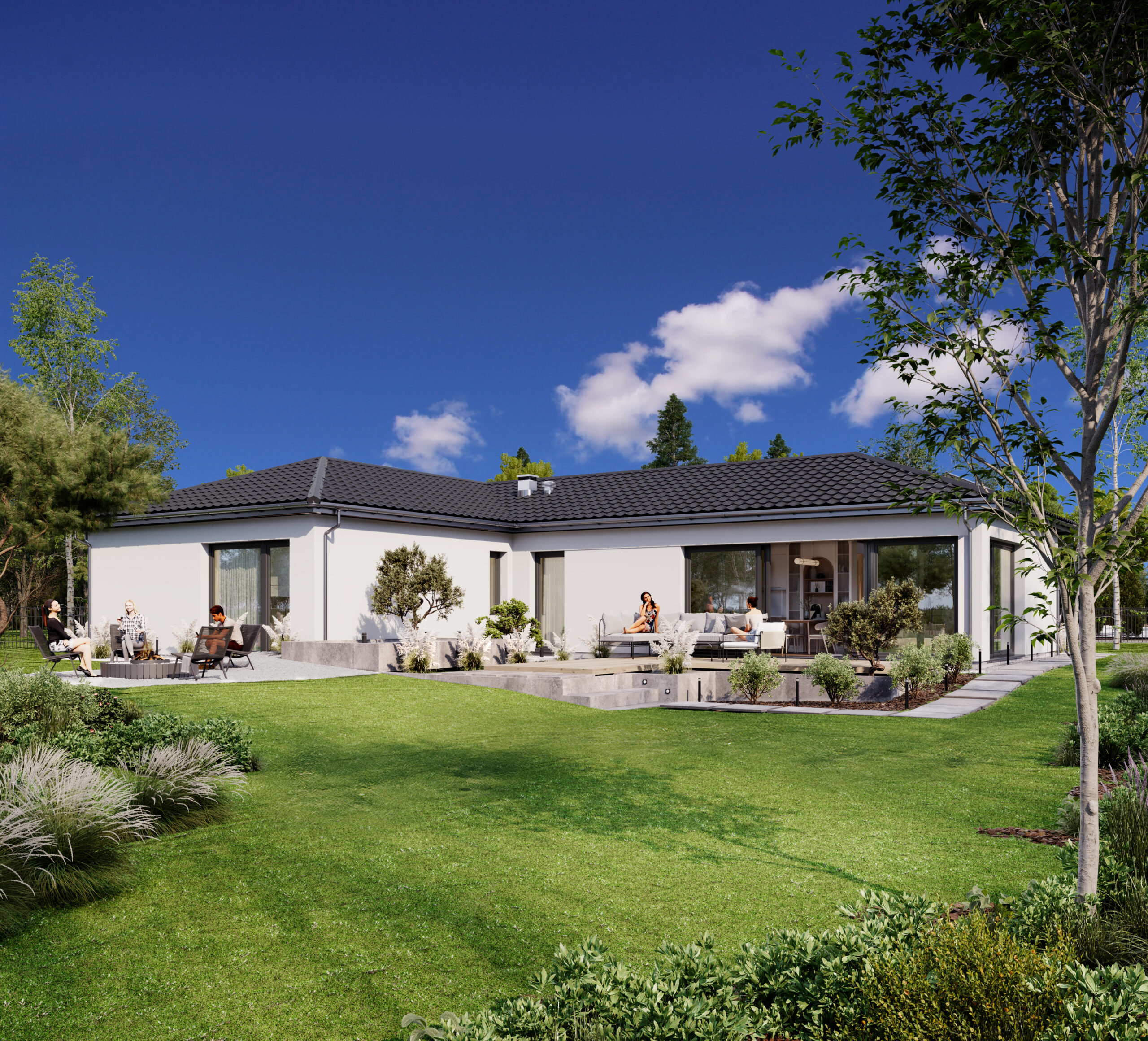 Nowy model parterowego domu w kształcie litery L. Wewnętrzny tarasowy dziedziniec okala bryła budynku, domykając całość i tworząc zaciszne prywatne miejsce.