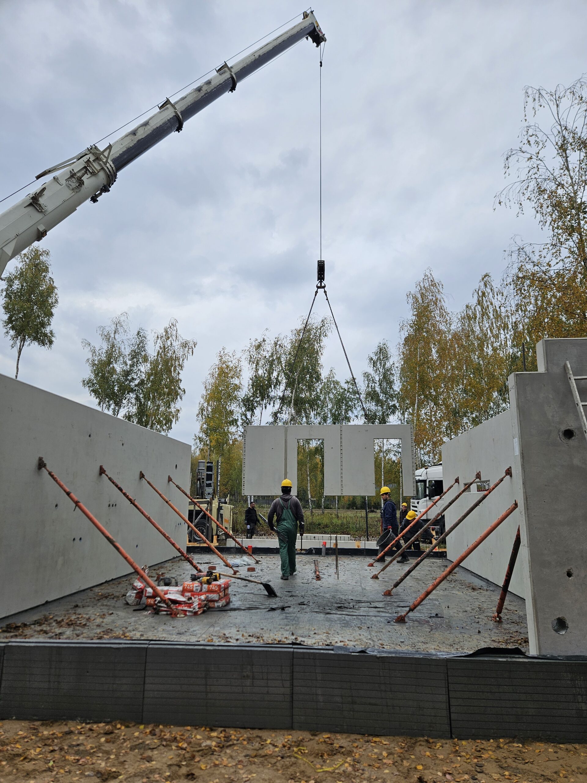 Ciężki sprzęt ustawił ściany w odpowiedniej kolejności, a ekipa montażowa zakotwiła je do płyty fundamentowej i połączyła systemowymi łącznikami, które zapewniły stabilność konstrukcji.