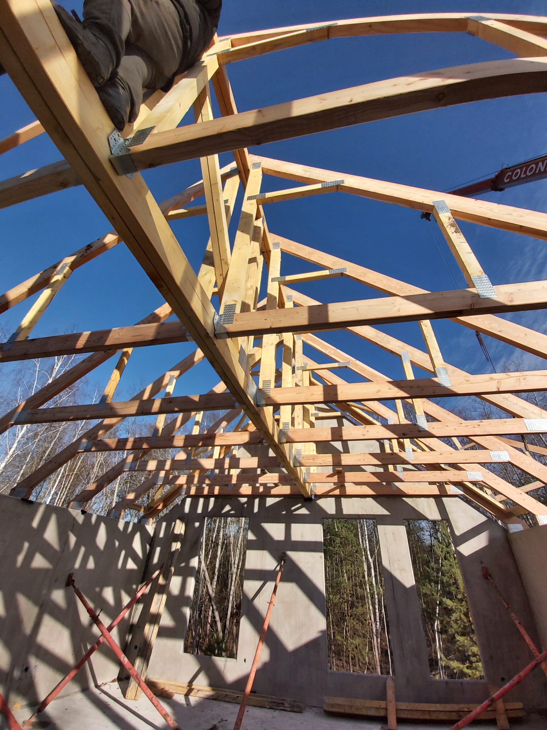 Na budowę zostały dostarczone prefabrykowane wiązary drewniane, czyli gotowe elementy tworzące kompletną więźbę dachową. Każdy z nich został wykonany zgodnie z projektem technicznym, co pozwoliło na szybkie (zaledwie jeden dzień) i precyzyjne ustawienie konstrukcji bez konieczności docinania elementów na miejscu.