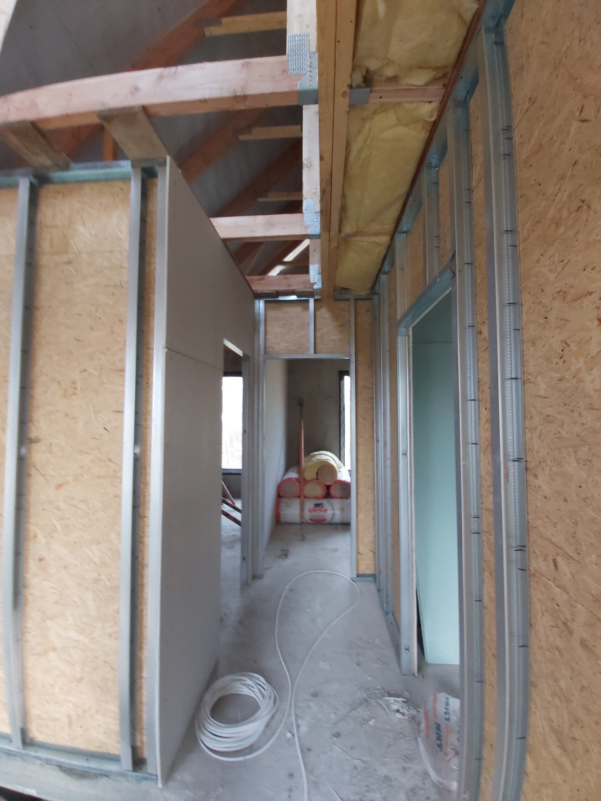 W ramach tego etapu wykonaliśmy montaż ścian działowych wewnątrz budynku. Ściany zostały wykonane w technologii suchej zabudowy z płyt gipsowo-kartonowych, wzmocnionych płytami OSB.