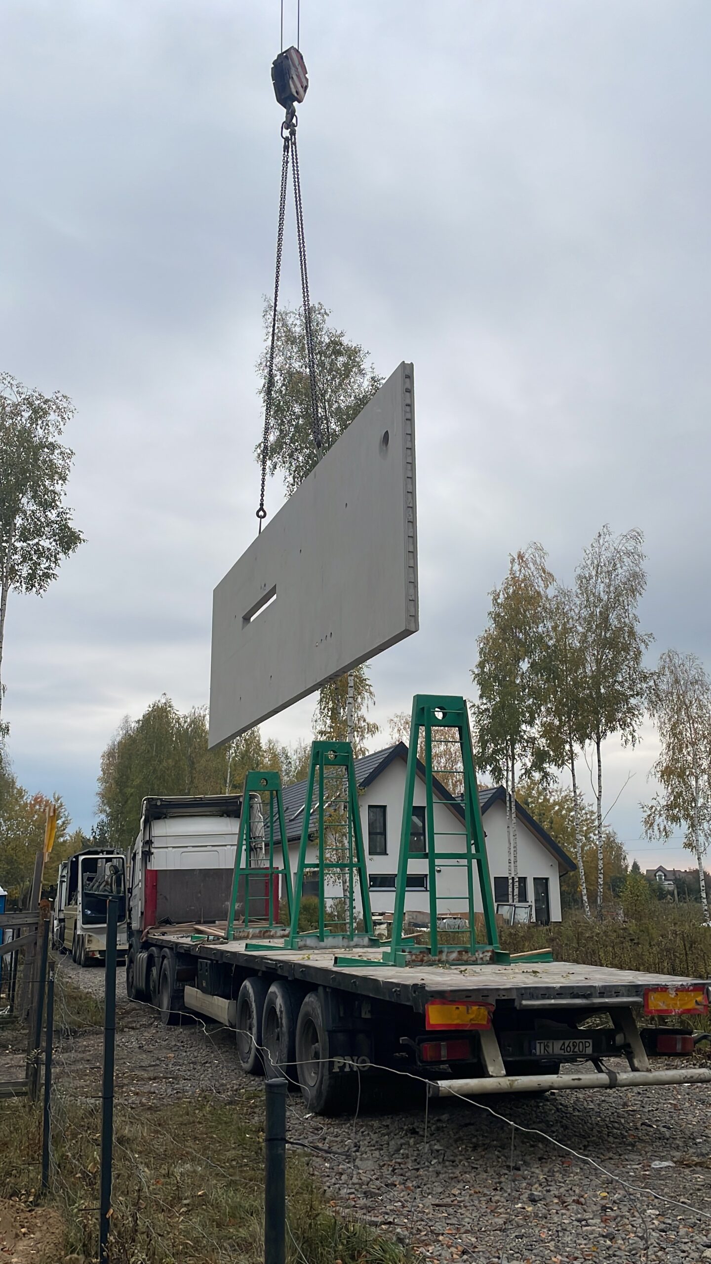 Na plac budowy inwestora dotarły gotowe elementy ścienne wyprodukowane w fabryce. Cały proces wyglądał jak składanie domu z dużych, idealnie dopasowanych klocków. Każdy element trafił na swoje miejsce z bardzo dużą dokładnością dzięki wcześniej przygotowanym punktom montażowym i precyzyjnym projektom wykonawczym.
