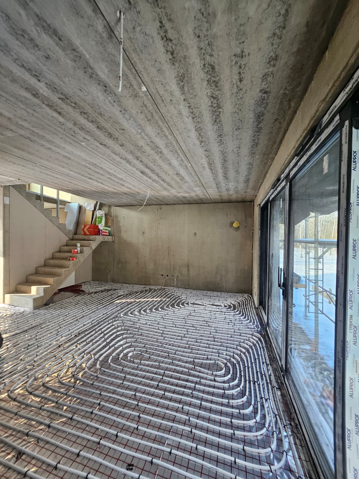 W ramach tego etapu zakończono montaż instalacji wodno-kanalizacyjnych oraz elektrycznych. Równolegle wykonano rozprowadzenie wodnego ogrzewania podłogowego we wszystkich pomieszczeniach zgodnie z projektem instalacyjnym. Instalacja ogrzewania podłogowego została przygotowana do kolejnego etapu prac i oczekuje na wykonanie warstw posadzkowych.